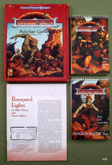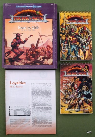 Dark Sun był pierwszym światem, który “kolekcjonowałem”, czyli kupowałem wszystko co do niego wyszło, część w ciemno sprowadzając z USA wprost z TSRu. Nie pamiętam, czy bardziej podobało mi się odejście od “średniowiecznego high fantasy”, czy może silne dla mnie inspiracje Diuną? Na pewno zaskoczył mnie na początku mroczniejszy ton settingu – w porównaniu z Forgottenami, DragonLancami czy nawet Ravenloftem. Post apokaliptyczny świat fantasy dla 18-latka był niezłą zagwozdką. Tu wyzwaniem było czasem przetrwanie na pustyni, a nie walka z hordą orków. Odkrywanie przeszłości, znajdowanie artefaktów dawnej potęgi, buntujący się niewolnicy-gladiatorzy, nietypowe podejście do magii, która przyczyniła się do katastrofy “ekologicznej” – to wszystko było nowe, wyjątkowe, wciągające.
