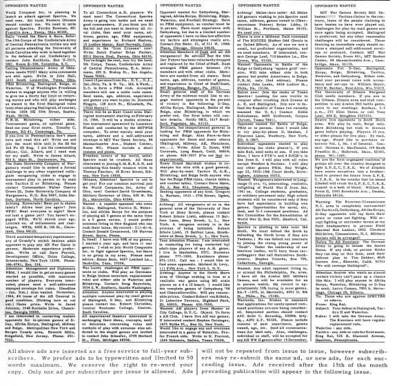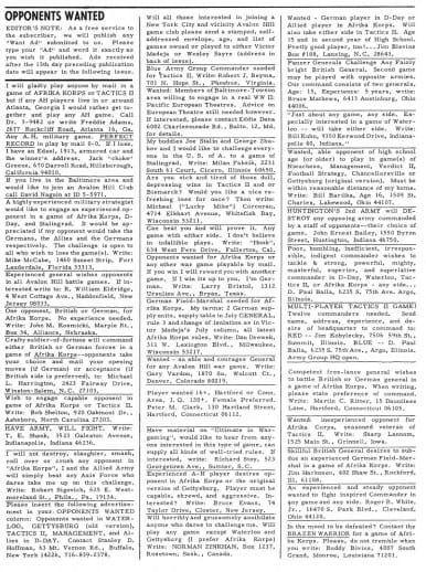 W czasopiśmie poświęconym głównie grom Avalon Hill pojawiła się kolumna “Opponents Wanted”, w której redakcja drukowała nieco zmienione ogłoszenia graczy poszukujących graczy – głównie w trybie play-by-email, ale również play-by-phone.