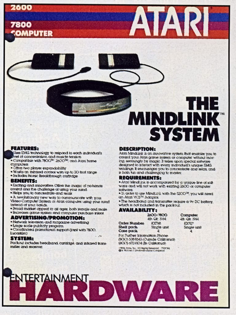 The absolute worst idea was the “brainwave headband” (also known as the Atari MindLink). Atari experimented with this idea in the early 80s. The concept was simple: Control the computer with your thoughts! A headband with simple detectors would detect your brainwaves and pass the results on to the computer. Such a device was built and actually worked after a fashion; you really could play a videogame using the device. However, the device picked up muscle control neuron activity just as easily as it picked up brain activity, and so it was easier to control it with head muscles than with brainwaves. During intense gameplay, players tended to scrunch their eyebrows around to control the headband, leading to excruciating headaches afterward. The product was never marketed.