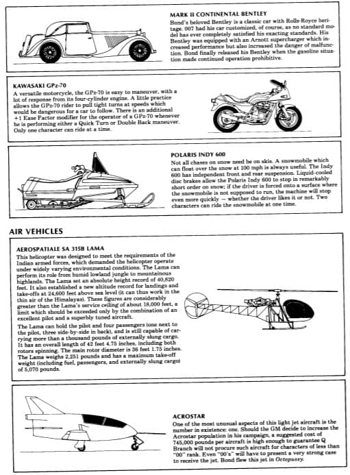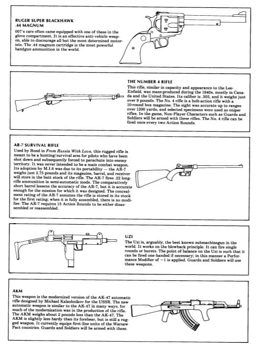 W podręczniku znalazły się nie tylko zasady walki, ale również hazardu, w tym oszukiwania. Ponadto opracowano też mechanikę sławy (Fame Points), bo przecież Bonda takoż rozpoznawali – choćby agenci Smiersz. Oczywiście wiele stron poświęcono wyposażeniu.