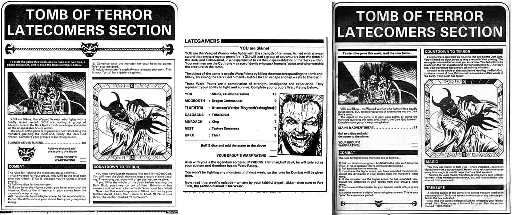 Zadebiutowała ona w numerze 446 z 30 listopada 1985 roku i zajmowała średnio 3-4 strony w numerze. Była to mieszanka prostych scenariuszy do narracyjnych gier fabularnych (taki dungeon crawl) z paragrafówkami i komiksami. Główną siłą napędową był rzecz jasna świat Sláine’a. Zasady były nieskomplikowane (oparte na k6), gdzieniegdzie pojawiały się mapy oraz proste zagadki. Gra zakończyła się w numerze 463, który ukazał się w marcu 1986 roku.