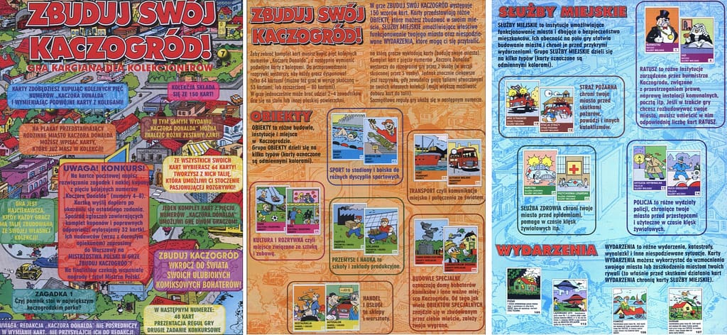 Tomasz Kołodziejczak był naczelnym “Magii” krótko, ale trafił idealnie w czas pierwszej fali “DoomTroopera”. Potem przeniósł się do Egmontu, gdzie jest do dziś, krzewiąc growo-komiksowy rynek. Na początku zaś zajmował się magazynem “Kaczor Donald”. I właśnie w tym czasopiśmie, w 1997 roku, ukazała się karcianka “Zbuduj swój Kaczogród”, za którą oczywiście stał Kołodziejczak. W każdym z numerów od 4 do 7 “Kaczora Donalda” dołączane były losowe karty ze 150 możliwych wzorów – zdarzało się, że atuty się powtarzały, więc trzeba było się wymieniać.