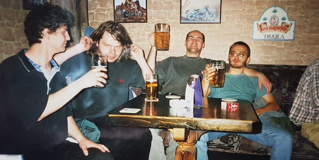 Z tych czasów pamiętam głównie wspólne wychodzenie na picie i do kina. Wędrówki do Hadesu, gdzie puszczali mocną muzykę i gdzie ze ścian spływał pot uczestników “rockowych potańcówek”. Wyjazdy redakcyjnym winstarem (auto sprowadzane z zagranicy dla funu prezesa i wygody, mogące przewieźć kilka osób) na konwenty i wakacje w górach czy nad jeziorami.