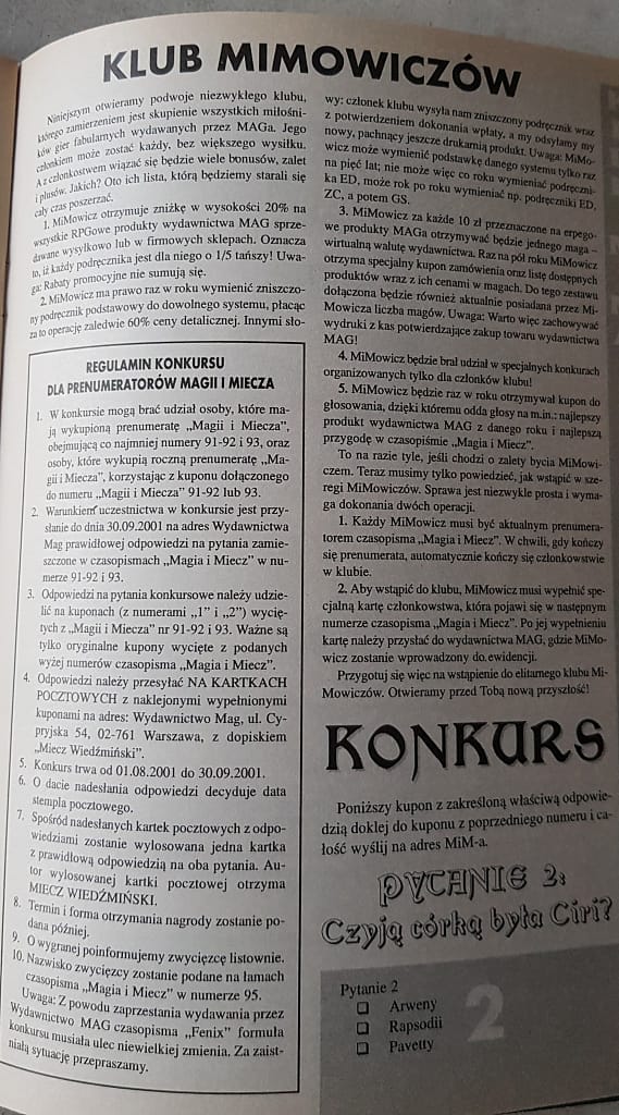 89 (05/01):Tu rozpoczęliśmy próbę zmiany formuły. Chcieliśmy przemodelować czasopismo na bardziej przydatne dla każdego miłośnika RPGie. Nawet gdy nie lubi jakiegoś systemu, to scenariusz z mapkami mu się przyda. Z drugiej strony, chcieliśmy zachęcić ludzi do kupowania podręczników, zakładając, iż z zysków będziemy mogli budować dalej MiMa. Było to de facto wymuszone przez chaotyczne decyzje Jacka dotyczące