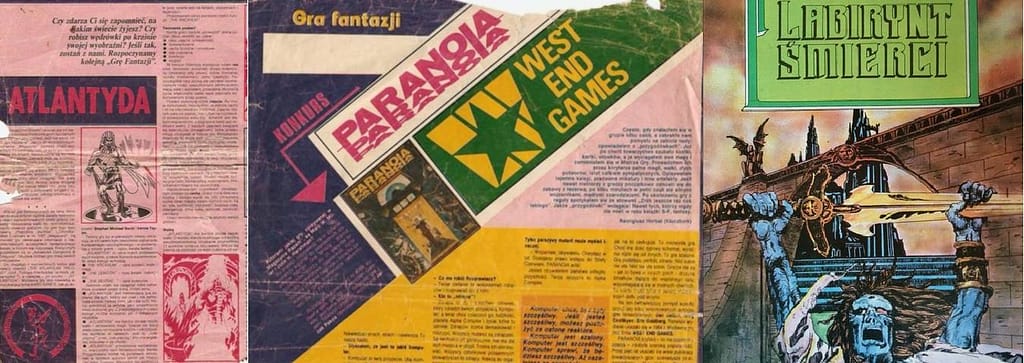 O wspomnianych grach fabularnych słyszałem nieco wcześniej. Oczywiście za sprawą artykułów w Razem. Wydawały się świetnym „przedłużeniem” literatury. Zresztą z perspektywy czasu muszę powiedzieć, iż w para-RPGie bawiłem się już dużo wcześniej, opowiadając z kolegą przygody w świecie stworzonym na bazie “Labiryntu Śmierci” – tej wciąż w wielu kręgach słynnej planszówki.