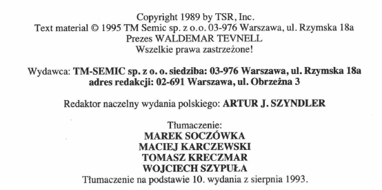 Finalnie nasza czwórka dokonała przekładu tylko i wyłącznie „Podręcznika gracza”, który ukazał się w 1995 roku. Dopiero w 1996 na rynku zadebiutował „Podręcznik Mistrza Podziemi” i „Księga potworów”. W międzyczasie gracze doczekali się niezwykłych akcesoriów, czyli „Kart postaci” i zasłonki/ekranu MP. Ponieważ w MiMie nie było za wiele o AD&D, rozgrywanie sesji w tym systemie było bardziej niż trudne. Zabrakło zwyczajnej ciągłości w wydawaniu podręczników. Nie było przygód, nie było zasad, nie było gry… TM Semic próbował się ratować publikacją czasopisma z przygodami do AD&D i… Kryształów Czasu – z przyczyn oczywistych dla każdego, kto znał osobę redaktora naczelnego. Jeśli mnie pamięć nie myli, nie ukazał się żaden numer, a nam w redakcji MiMa próbny wydruk pokazywał Artur.