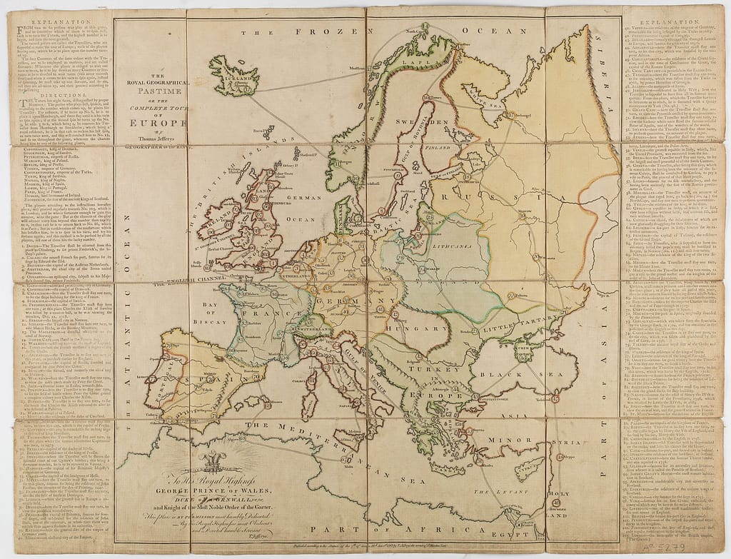 Tymczasem 14 września 1759 roku John Jefferys opublikował “A Journey Through Europe”. Gra była efektem próby autora rozszerzenia asortymentu sprzedawanych produktów, czyli map. Cechowały ją barokowe opisy działania poszczególnych pól, jak na przykład: