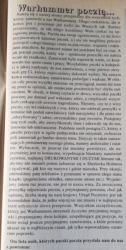 Potem przez dłuższy czas na łamach MiMa milczano – przynajmniej w kontekście wydania WFRP. Dopiero numer 9 (4/94) zawierał przedrukowane materiały z czasopisma White Dwarf oraz reklamę polskiej wersji systemu. W numerze 11 (6/94) przepraszamy – MY, bo już byłem wówczas członkiem redakcji – za problemy w realizacji zamówień. Ujmując rzecz inaczej i bardziej wprost: był kłopot z wysłaniem podręcznika wszystkim.